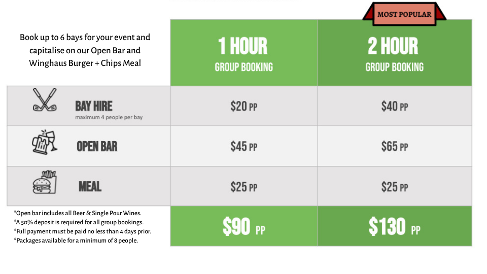Please note – Eagle and Birdie package bookings require a 50% deposit upon booking & full payment to be made 4 days prior to your event. PAYG Bookings require full cost of bay hire to be paid upon making your booking.